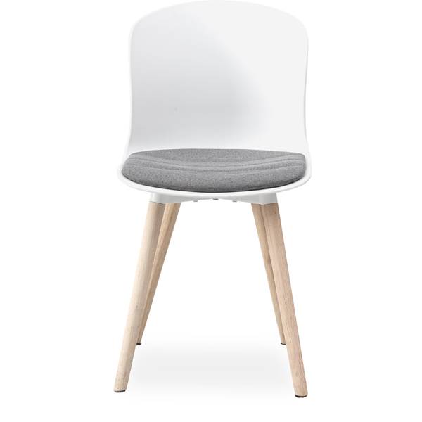 matstol, maxbelastning 110 kg och siddehøjde 47 cm. – Sittskal i formstöpt vit plast, kudde i grått tyg och ben i vaxlackerad ek
