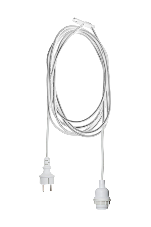Upphäng för utomhusbruk med 500 cm vit gummikabel. Max vikt för lampskärm och ljuskälla är 2 kg för detta upphäng. Bredd 5 cm, djup 5 cm och höjd 500 cm. Lamphållare 1xE27. Max 25W. Ojordad.