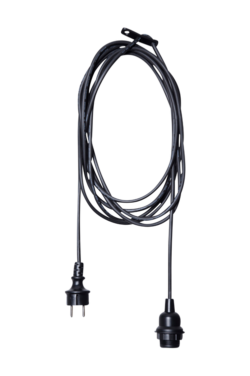 Upphäng för utomhusbruk med 500 cm svart gummikabel. Max vikt för lampskärm och ljuskälla är 2 kg för detta upphäng. Bredd 5 cm, djup 5 cm och höjd 500 cm. Lamphållare 1xE27. Max 25W. Ojordad.