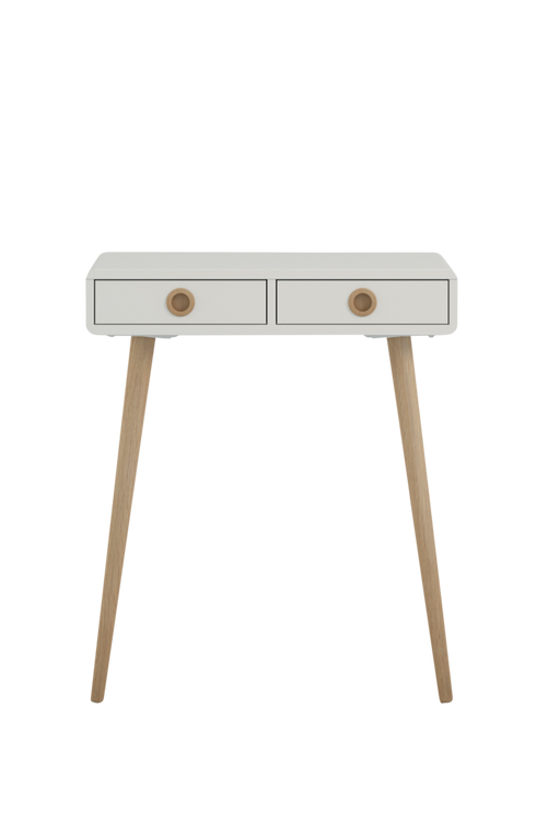 Vägg- / skrivbord med 2 lådor. Tillverkad i lackerad MDF och massiv ekhandtag och ben. Enkel självmontering.