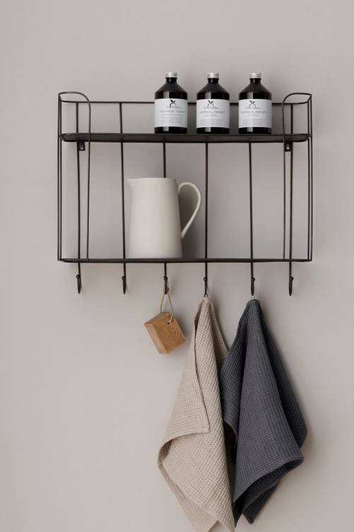 Vägghylla för t.ex. kök, badrum och hall med 2 hyllplan. 6 krokar. Av metall. Bredd 60 cm. Djup 19 cm. Höjd 48 cm. Höjd mellan hyllplanen 28 cm.