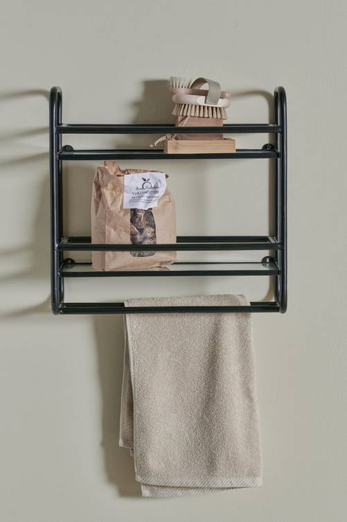 Vägghylla i pulverlackad metall med 2 hyllplan i klarglas. Hyllplanens tjocklek 4 mm. Mått på hyllplan 40×14 cm. Väggupphängning på baksidan med 4 fästen. Skötselråd: Avtorkas med mjuk fuktig trasa. Endast avsedd för inomhusbruk.