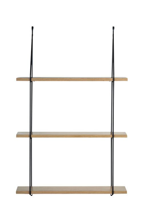 Vägghylla med 3 hyllplan i faner och konsoller i metall. Hyllan är 58 cm bred, 89 cm hög och 20 cm djup.