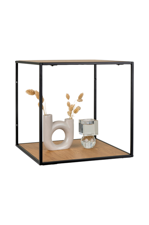Vägghylla med hyllplan av spånskiva och stålram. Omonterad. 36 x 36 x 36 cm. 2,6 kg