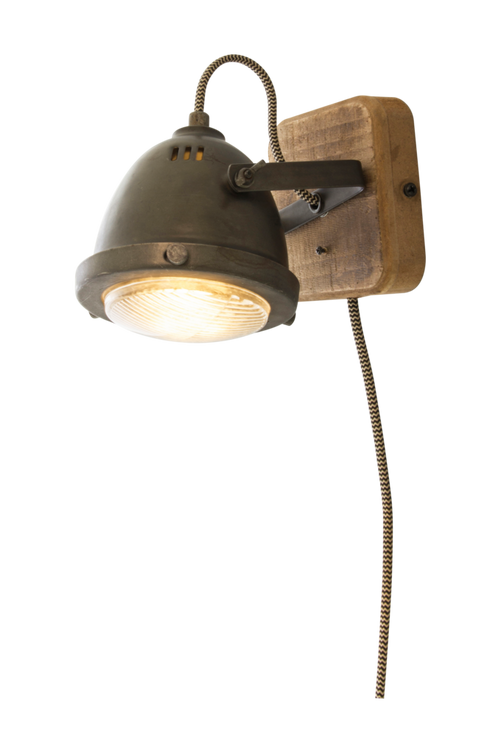 Vägglampa i metall och trä. Ljusströmbrytare på sladden. Ljuskälla ingår inte.