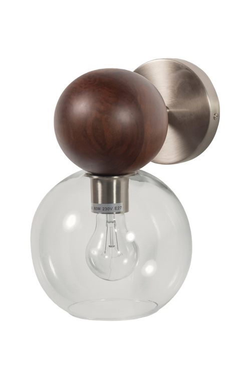 – vägglampa med retrokänsla – tillverkad av metall, valnötsträ och glas – ingår i kollektionen Babble – H 29 cm x B 19 cm x D 27 cm tillbaka till 70-talet med Babble! Denna lampkollektion från det nederländska inredningsmärket BePureHome tar dig tillbaka till 70-talet: runda former, valnötsträ i varm nyans och glänsande metall – Babbel har allt! material Babbles polerade metall är mycket glänsande och ger vackra reflektioner. Lampskärmens genomskinliga glas sprider ljuset i 360 grader. Valnötsträet har en varm nyans och ger denna lampkollektion en sann retrostil. mått – höjd: 29 cm – bredd: 19 cm – djup: 27 cm – väggfäste: Ø 12 cm x D 2,5 cm – silverfärgad del: Ø 1,5 cm x D 8 cm – träkula: H 11 cm x Ø 12 cm – glasskärm: H 16 cm x Ø 17 cm – öppning: Ø 9,5 cm – sockel: E27 – specifikationer: 230 V, 60 W, energimärkning A++ till E – LED-lampa: rekommenderas skötsel håll lampan dammfri genom att regelbundet torka av med en ren, torr trasa. Du kan ta bort fingeravtryck eller fläckar med en lätt fuktad trasa utan rengöringsmedel. Torka av efteråt, för att undvika märken. leverans produkten levereras i ett paket. Vi rekommenderar att läsa installationsanvisningen noga för att undvika olyckor. Lampan säljs utan monteringsmaterial och ljuskälla.