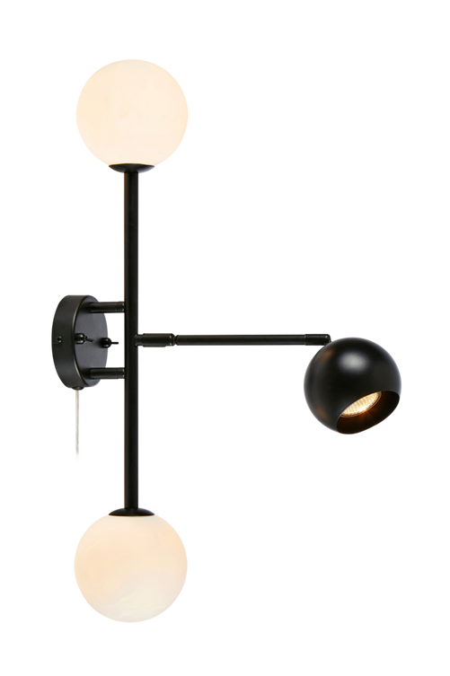 Vägglampa Beside från Markslöjd har en bas i metall med två skärmar i glas och en skärm i metall. Den har en justerbar arm i mitten och en 200 cm långt kabel i plast, med separata brytare på väggplattan och stickkontakt. G9 sockel på översta och nedersta armen med max 20W. GU10 sockel på mittersta armen med max 7W. Ljuskällor ingår ej.