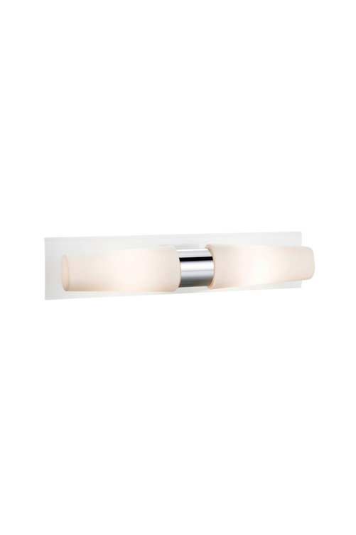 Vägglampa för badrum i vit metall med två vita glasskärmar. IP44. Max 2x40W. E14-sockel. Höjd 11,5, djup 9, bredd 40 cm.