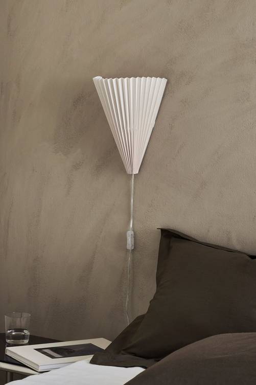 Vägglampa med skärm i plisserad textil och detalj av metall. Transparent sladd med strömbrytare. Sockel E14. Max 5W.