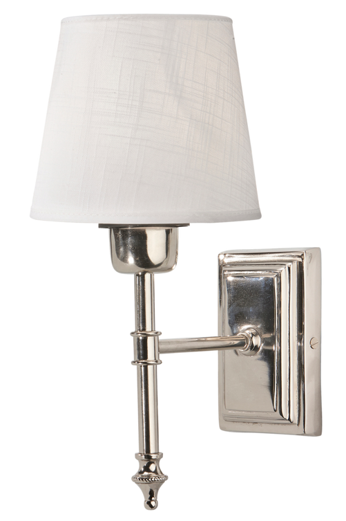 Vägglampa i metall. Höjd 20 cm, bredd 8 cm, djup 18 cm. Sladd med strömbrytare, sladdlängd 1,8 m. E27, max 40 W. Skärm Mia, diameter 14/10 cm. Höjd 12,5 cm. Laminerat linnetyg. Total höjd 27 cm.