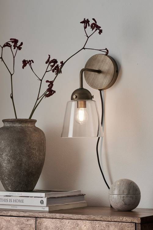 Vägglampa i metall med antikfinish och skärm av klarglas. Textilsladd med strömbrytare, sladdlängd 150 cm. Lampans höjd 16 cm. Väggplattans mått: diameter 12 cm, djup 2,5 cm. E14. Max 25W. Ljuskälla ingår ej. Olika typer av ljuskällor kan ha stor påverkan på stil och utseende hos lampan. Prova dig fram till ditt eget uttryck!