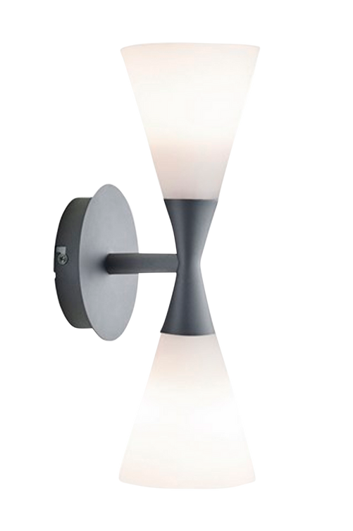 Harlekin Duo är en elegant och stilfull vägglampa. Den vackra designen ger ett mjukt upp- och ner ljus som passar perfekt i din hall. Ljuskällor ingår ej.