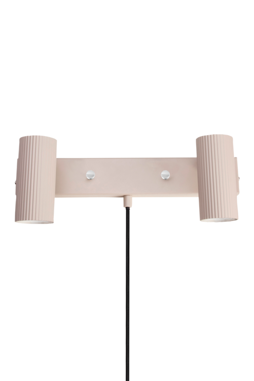 Vägglampa Hubble 2 Hubble är en modern vägglampa med två tubformade och räfflade skärmar gjorda av metall. Skärmarna är vinklingsbara i höjd- och sidled. Lampan har en 200 cm lång textilkabel med stickkontakt. Brytarna är placerade på väggplattan (on/off, ej dimmer). Lampan kan enkelt användas för fast installation om så önskas. Design: Patrick Hall. Lamphållare: 2xGU10 28W. Ljuskälla medföljer ej.