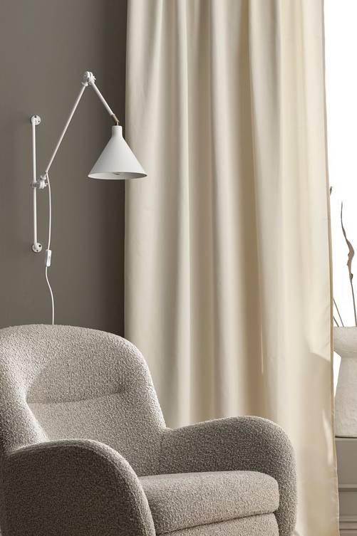 Vägglampa i pulverlackad metall, monterad på ett väggfäste med höjden 50 cm. Två armar som är justerbara i höjdled. Skärmen har vit insida och är justerbar i höjd- och sidled. Hela lampan kan justeras på väggfästet i höjd- och sidled. Längd på armarna 40 resp. 20 cm. Mått på skärm: höjd 17 cm, Ø 20 cm. Plastsladd med strömbrytare, sladdlängd 2 m. Stor sockel E27. Max 25W. Ljuskälla ingår ej.