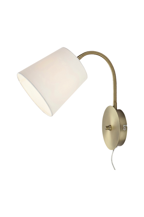 Vägglampa i metall och textil. Dimmer-möjlighet på lampan. Ljuskälla ingår inte.