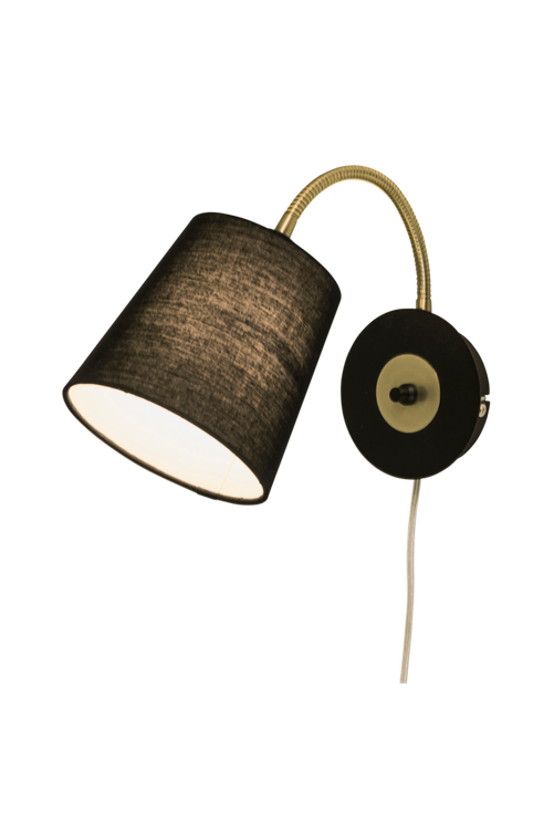 Vägglampa i metall och textil. Dimmer-möjlighet på lampan. Ljuskälla ingår inte.