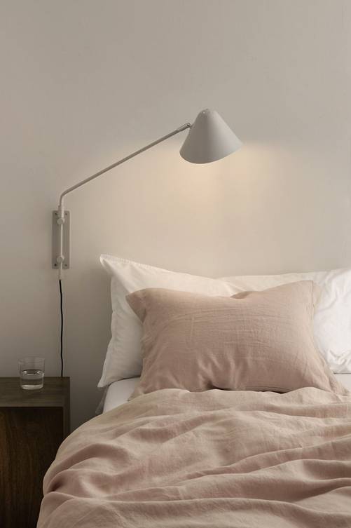 Vägglampa av matt metall med kromdetaljer. Vit insida. Armen är svängbar i sidled och skärmen är ledbar i höjd- och sidled. Höjd ca 55 cm. Bredd från vägg 70 cm. Väggplattans längd 20 cm. Textilsladd med strömbrytare, längd 2 m. Stor sockel E27. Max 60 W. Ljuskälla ingår ej.