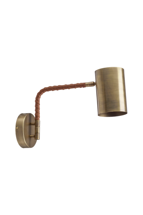 Vägglampa Nora i metall komplett med metallskärm i antikmässing och med fuskläderband virat runt stommen. En enkel och modern variant. Svart textilsladd 180 cm med strömbrytare. E27 sockel. Max 40W. IP20. Armen går att svänga i sidled och skärmen har ett ledat fäste. Väggavstånd ca 38 cm inklusive skärm. Höjd ca 28 cm inklusive skärm. Ljuskälla ingår ej.