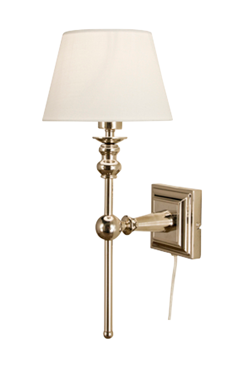 NORA vägglampa med vit ledning och strömbrytare på sladd. Elanslutning med stickpropp.