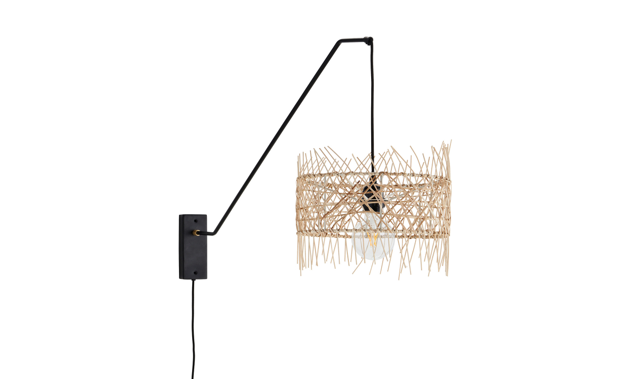 En modern vägglampa med en lampskärm i rotting som bidrar till en naturnära känsla. Lampan passar i uterummet, hallen, kök och sovrum där den bidrar till en modern stil med inslag av naturmaterial.Design & egenskaperModern vägglampa som bidrar till en naturlig känsla. Lampans skärm är tillverkat av rotting som har flätats till en cirkel, där rottingens ändar sticker ut och bildar en vacker krans både i ovankant och underkant.Stommen är av svartlackerad järn och sätts fast i väggen. Stommen är vinklad utåt från väggen och från den går en svart lampsladd med en sockel för glödlampan som placas mitt i lampskärmen.LED-lampa rekommenderas vid användning.