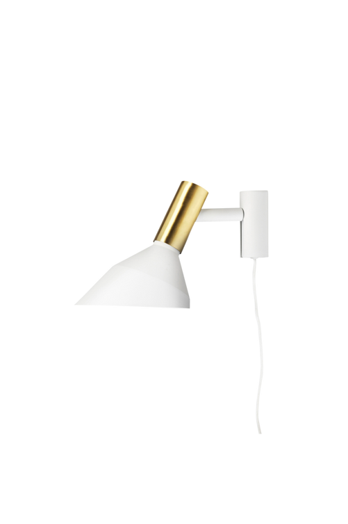 Why är en stilren vägglampa i vit metall med mässingsdetaljer. Höjd 28cm, bredd 17cm, längd 17cm. Vit textilsladd, 2 meter, med strömbrytare. Ljuskälla ingår ej.