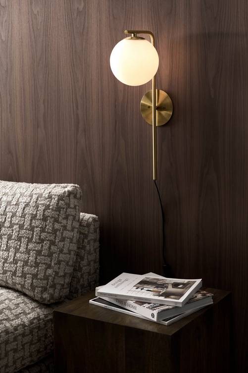 Vägglampa i mässingsfärgad metall eller pulverlackad svart metall med kupa i opalvitt glas. Kupan fästs och lossas genom skruvfunktion. Väggplattans diameter 12 cm, glaskupans diameter 15 cm. Svart plastsladd med strömbrytare och svart väggkontakt. Ljuskälla ingår ej.