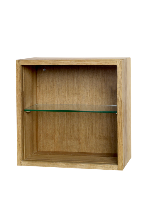 Väggvitrin i oljad ek med 1 st glashyllplan. Bredd 32 cm. Djup 17 cm. Höjd 32 cm. Vikt 4,5 kg.