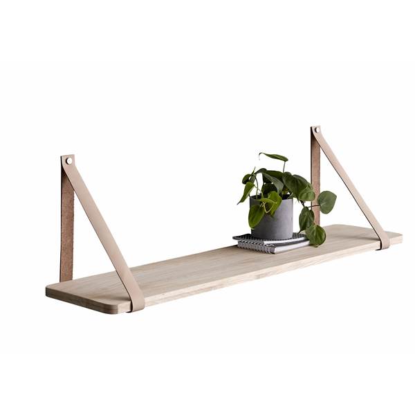Vägghylla, maxbelastning 10 kg. – Massivt obehandlat kejsarträd och ljusbrun rem i kärnläder