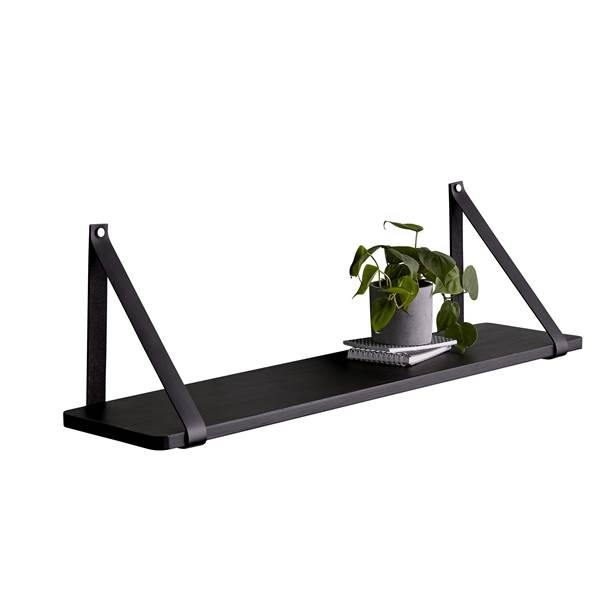 Vägghylla, maxbelastning 10 kg. – Massivt svartmålat kejsarträd och svart kärnläderrem