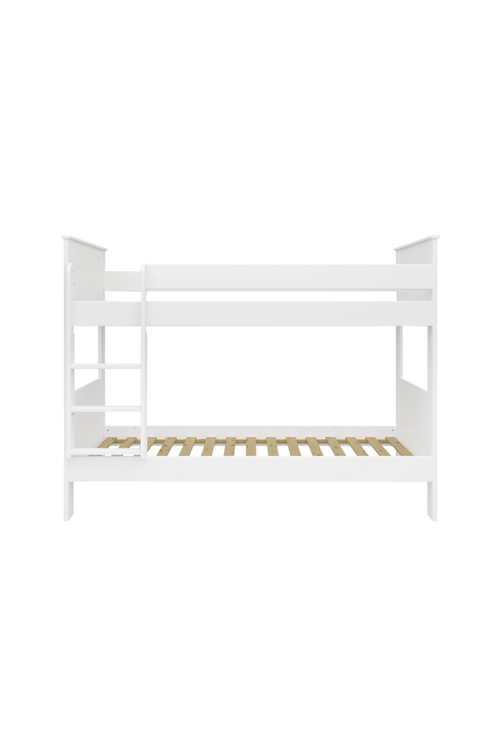 Våningssäng med stege (kan placeras båda L + R) tillverkad i lackerad MDF med massiva tallplattor. Madrassstorlek: 75×200 cm (madrass ingår inte). Enkel självmontering.