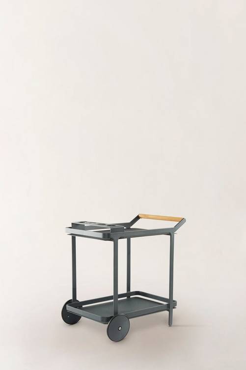 Serveringsvagn av pulverlackerad aluminium med matt yta och bekvämt, runt handtag av trä. VENEZIA gör livet på altanen enklare till exempel när du ska servera vid bordet eller vid grillen som tillbehörsvagn. En praktisk hållare för fyra glas eller flaskor ingår och matchar vagnen perfekt. Den kan du placera var du vill på vagnen. Hjulparet i framkant gör den enkel att köra, du bara lyfter och rullar fram och serveringsvagnen står stabilt eftersom den bara har ett hjulpar. Aluminium är ett bra och tåligt material utomhus och det rostar inte. Viss montering krävs. Produkten består även av teakträ som är avverkat från ett hållbart och ansvarsfullt skogsbruk vilket tar hänsyn till både människor och miljö. Kontakta gärna vår kundtjänst om du har frågor kring hur vi arbetar med hållbar teak. Material: Aluminium och teak. Storlek: Höjd 82 cm, bredd 78,5 cm, djup 50 cm. Höjd mellan avlastningshyllan och bordsskivan 58 cm. Mått flask-/glashållare 12,2×46 cm, hål ø 8 cm. Skötselråd: Torkas av med lätt fuktad trasa. Tips/råd: Stolen BIELLA finns i matchande färger och passar perfekt tillsammans med VENEZIA.