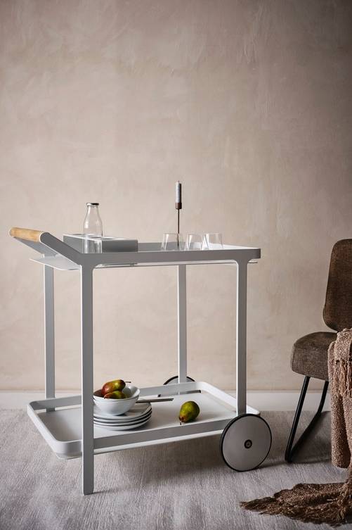 Serveringsvagn av pulverlackerad aluminium med matt yta och bekvämt, runt handtag av trä. VENEZIA gör livet på altanen enklare till exempel när du ska servera vid bordet eller vid grillen som tillbehörsvagn. En praktisk hållare för fyra glas eller flaskor ingår och matchar vagnen perfekt. Den kan du placera var du vill på vagnen. Hjulparet i framkant gör den enkel att köra, du bara lyfter och rullar fram och serveringsvagnen står stabilt eftersom den bara har ett hjulpar. Aluminium är ett bra och tåligt material utomhus och det rostar inte. Viss montering krävs. Produkten består även av teakträ som är avverkat från ett hållbart och ansvarsfullt skogsbruk vilket tar hänsyn till både människor och miljö. Kontakta gärna vår kundtjänst om du har frågor kring hur vi arbetar med hållbar teak. Material: Aluminium och teak. Storlek: Höjd 82 cm, bredd 78,5 cm, djup 50 cm. Höjd mellan avlastningshyllan och bordsskivan 58 cm. Mått flask-/glashållare 12,2×46 cm, hål ø 8 cm. Skötselråd: Torkas av med lätt fuktad trasa. Tips/råd: Stolen BIELLA finns i matchande färger och passar perfekt tillsammans med VENEZIA.