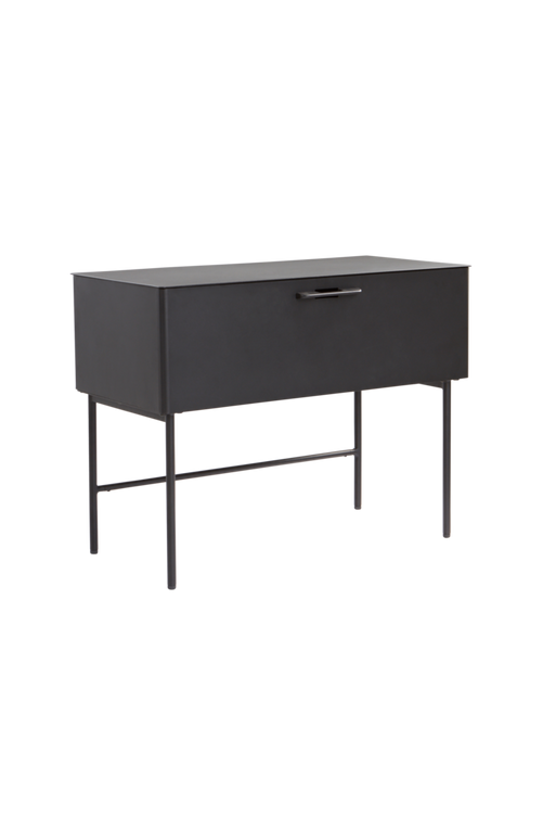 Byrå av pulverlackerat stål. Byrån har en låda som glider mjukt och har stopp i utdraget läge. Handtaget smälter in fint i möbeln. VERNON är en nätt och stilren serie som gör sig fint i både hall och sovrum. Möblerna har mjukt rundade hörn och en liten retrokänsla infinner sig. Material: Stål. Storlek: Höjd 55 cm, bredd 70 cm, djup 35 cm. Frihöjd under möbel 33 cm. Höjd till tvärstag i bakkant 12,5 cm. Lådans innermått 61×30 cm. Skötselråd: Torkas av med lätt fuktad trasa.