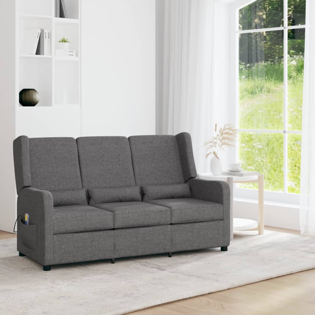 Den här 3-sits massagestolen är en utmärkt sittlösning för ditt vardagsrum. Reclinerfåtöljen är tjockt vadderad och klädd i starkt tyg. Den är tillverkad av en robust ram av metall och trä och är mycket bekväm och hållbar. Den här elektriska massagestolen har 6 massagepunkter för rygg, sits och ben som sänder ut avslappnande vibrationer. Med den medföljande handkontrollen kan du välja olika massageprogram. Sätet kan också värmas upp för extra avkoppling med en enda knapptryckning. Ryggstödet kan justeras bakåt och fotstödet kan justeras uppåt. Denna position gör det möjligt för dig att ligga bekvämt. Upplev en härlig stund i vår massagefåtölj!