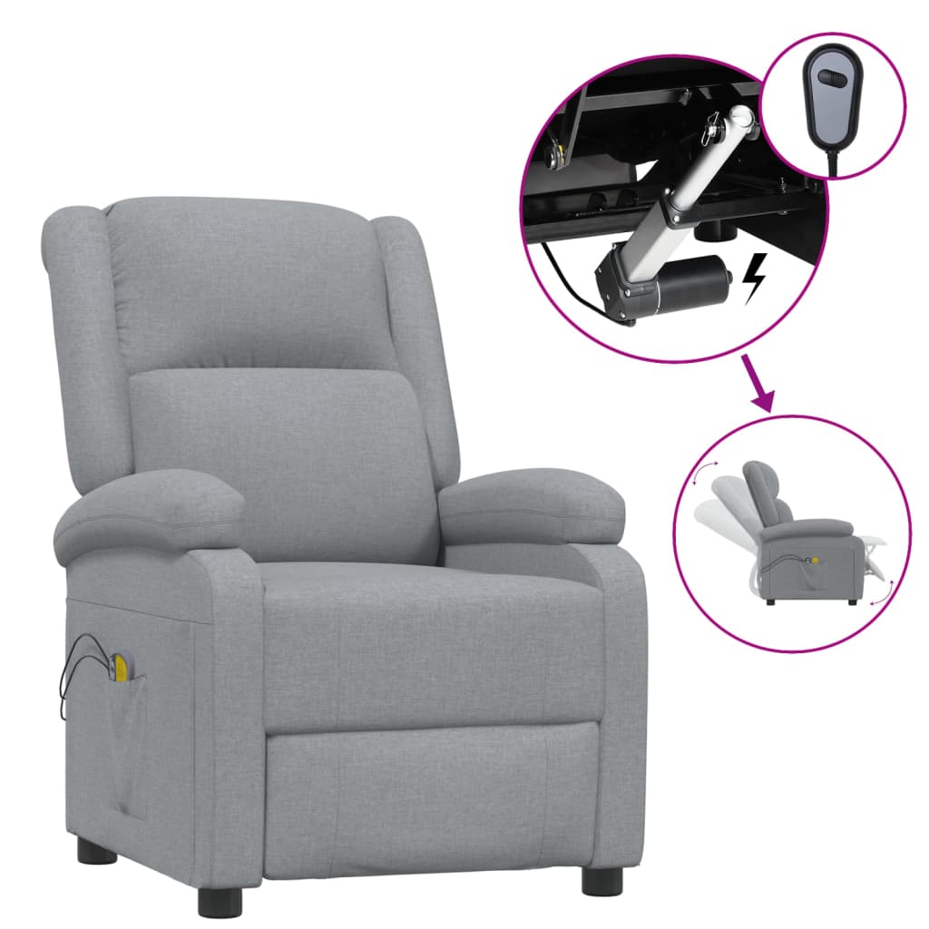 Vår elektriska reclinerfåtölj är en utmärkt sittlösning för ditt vardagsrum. Massagefåtöljen är tillverkad i tyg, har en metallram och är stoppad med skum, vilket gör den stabil och mjuk att sitta på. Denna elektriska massagestol har 8 massagepunkter för rygg, säte och ben. Den medföljande handkontrollen låter dig välja olika massageprogram. Denna fåtölj är utrustad med en elmotor som gör att du enkelt kan justera ryggstödet och fotstödet bakåt eller framåt med en praktisk kontroll. Denna massagefåtölj har även en sidoficka för handkontrollen. Upplev en härlig stund i vår massagefåtölj!