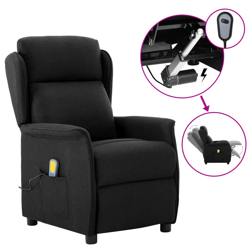Vår elektriska massagefåtölj har lutnings- och värmefunktion. Denna justerbara TV-stol är en utmärkt sittlösning för ditt vardagsrum. Den elektriska massagefåtöljen är gjord av tyg och har en ram i järn, fylld med skum och pp-bomull, vilket gör den stabil och mjuk att sitta i. Den elektriska massagestolen har 6 massagepunkter för huvud, nacke, rygg och ben för att skicka avkopplande vibrationer. Med ett tryck på knappen kan sätet också värmas upp för en extra avkoppling. Denna fåtölj är utrustad med en elektrisk motor, som gör att du enkelt kan justera ryggstödet och fotstödet bakåt eller framåt med en praktisk kontroll. Denna massagefåtölj är också utrustad med sidoficka för fjärrkontrollen. Upplev en härlig stund i vår elektriska massagefåtölj!