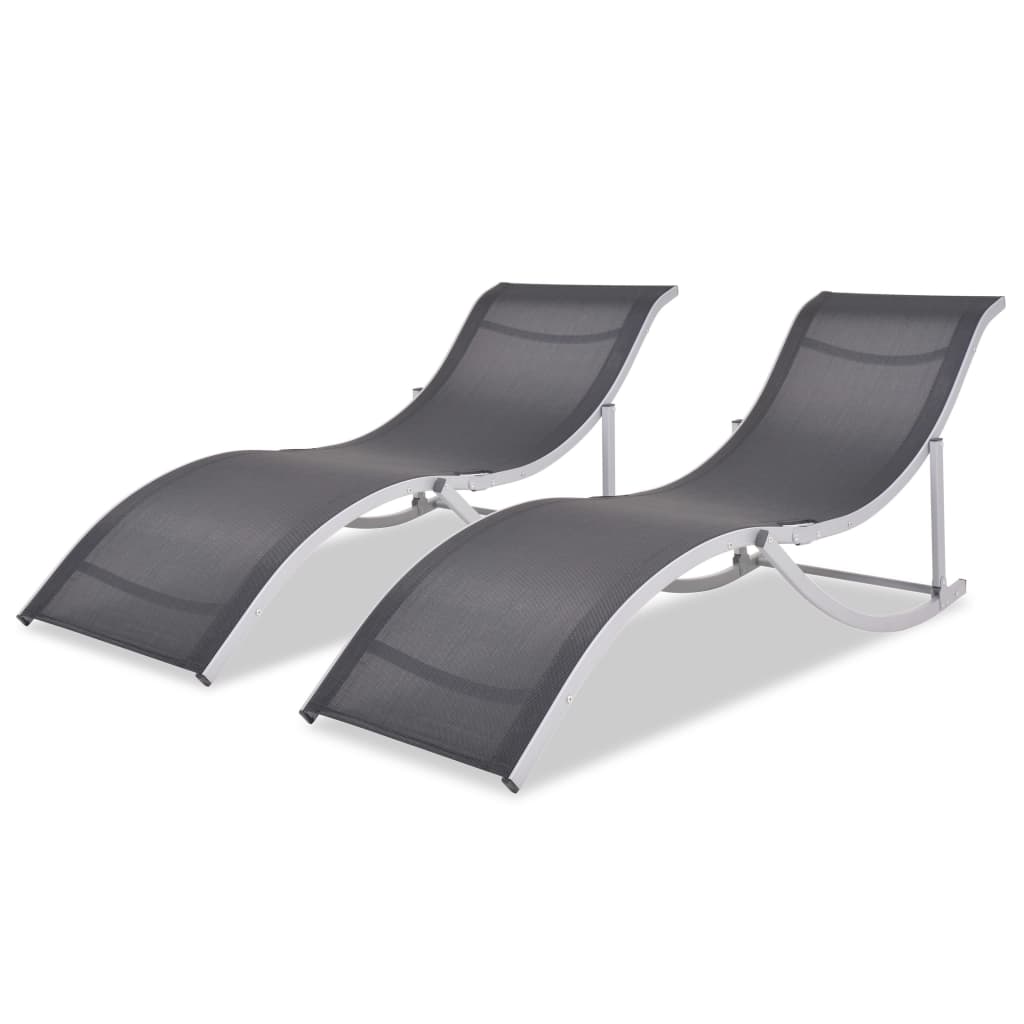 Luta dig tillbaka i våra bekväma solstolar! Denna hopfällbara uppsättning solstolar är perfekt för att njuta av din fritid på uteplatsen, i trädgården eller vid poolen. Solstolarna har en slående, krökt design. Deras ramar är gjorda av robust aluminium, och sätena och ryggstöden är gjorda av starkt textilenetyg. Solstolarna är stabila, mycket hållbara och väderbeständiga. Solstolarna har en ergonomisk design som följer kroppens konturer, så att du kan slappna av i en bekväm position. Den strömlinjeformade designen bidrar också till dessa moderna solstolars estetiska attraktion. Dessa solstolar kan fällas ihop för att spara utrymme när de inte används. Vid leverans ingår 2 hopfällbara solstolar. OBS: Produkten är redan monterad; ingen montering krävs.