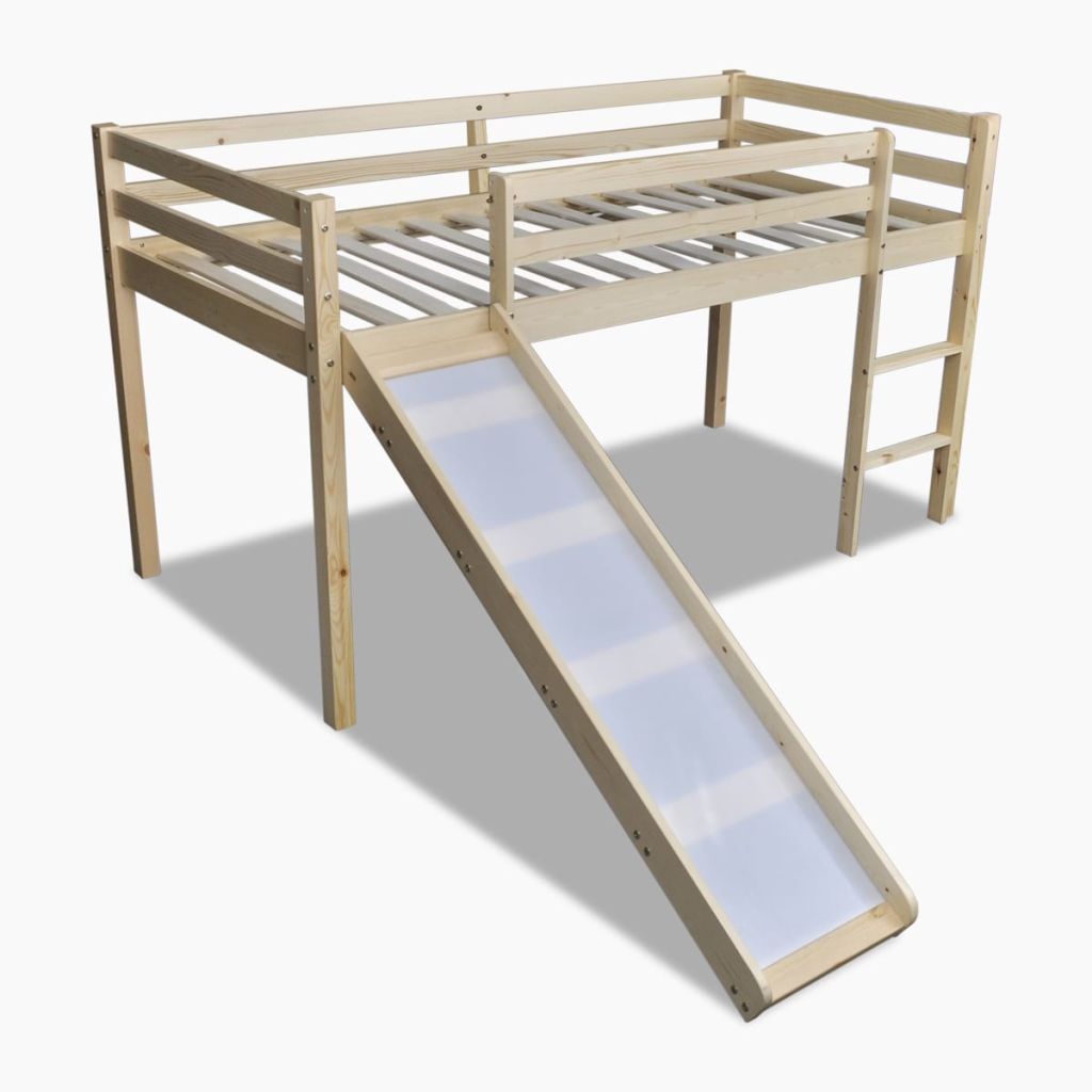 Denna loftsäng är gjord i naturligt färgat starkt trä. På båda sidorna av vår loftsäng finns räcken som skyddar barnet från att falla ur den i sömnen och på undersidan kan barnen vistas, det ger dem ännu mer utrymme att leka på. Vår loftsäng har dessutom både en rutschbana och en stege.