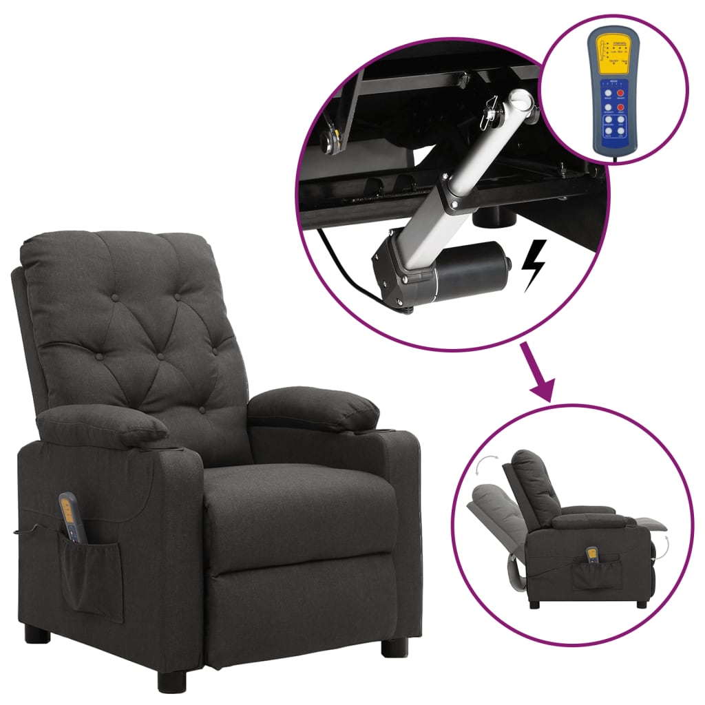Luta dig tillbaka och koppla av i den här mycket bekväma massagefåtölj som är klädd i tyg av premium kvalitet! Massagefunktion: De 6 massagepunkterna låter dig uppleva en bättre riktad massage. Elektrisk lutningsfunktion: Upplev den mest bekväma positionen medan du kopplar av i denna unika produkt. Den medföljande fjärrkontrollen gör att du enkelt kan justera ryggstödet och fotstödet enligt dina behov.Lyftfunktion: Denna reclinerfåtölj är utrustad med en elektrisk motor för lyftfunktion. Tack vare uppresningshjälpen som skjuter upp hela stolen kan du enkelt ställa dig upp utan att stressa rygg och knän.Premium material: Detta tyg är exceptionellt bekvämt och mjukt. Stolen är också hållbar och har ett enkelt och rent utseende. Fåtöljen är tjockt stoppat för optimal komfort.Robust och stabil ram: Trä- och metallramen säkerställer robusthet och stabilitet.
