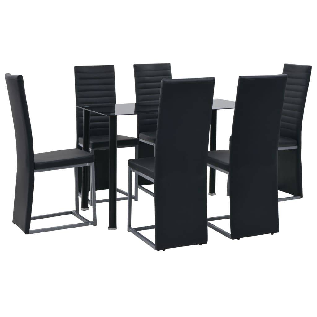 Denna matgrupp i 7 delar med en modern design blir en elegant detalj i din inredning. Bordsskivan är tillverkad i starkt härdat glas, som är tåligare än vanligt glas och enkelt att rengöra. Våra matstolar är klädda med konstläder och vadderade med skum som gör dem bekväma att sitta på. De pulverlackerade stålramarna gör stolarna stabila och hållbara. Denna matgrupp är lätt att montera. Leveransen omfattar 1 bord och 6 stolar.