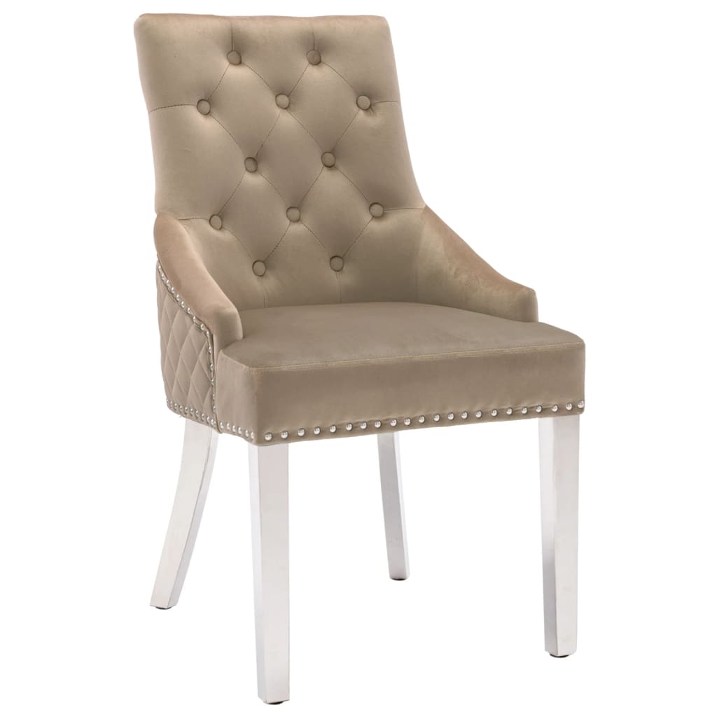 Lägg till en imponerande detalj i din inredning med denna matstol! Denna köksstol är klädd i mjuk sammet och vadderad med tjockt skum, vilket gör den bekväm att sitta i. Träramen och fötterna i rostfritt stål bidrar till hög stabilitet. Dessutom bidrar den dekorativa hängaren och knapparna till dess vackra design.