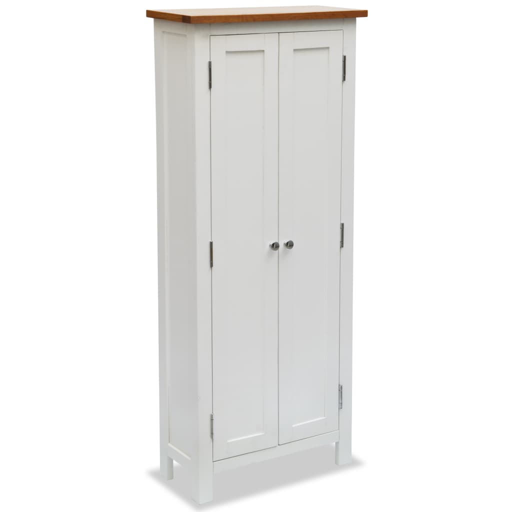 Vårt mediaskåp i två nyanser kommer att ge din inredning en elegant touch med sin tidlösa design. Förvaringsskåpet har 6 hyllor och erbjuder rikligt med utrymme för förvaring och organisering av dina DVD:er, CD:s, etc. Mediaskåpet har en ovansida i massiv ek vilket ökar dess stabilitet och hållbarhet. Ekträet har vackra ådringar som ger möbeln en känsla av naturlig charm. Kroppen är tillverkad i massiv furu med en vit finish och som har en modern stil. Dörrarna kommer skydda din samling av CD-skivor/DVD:er från damm och håll stök utom synhåll. Produkten kräver montering.