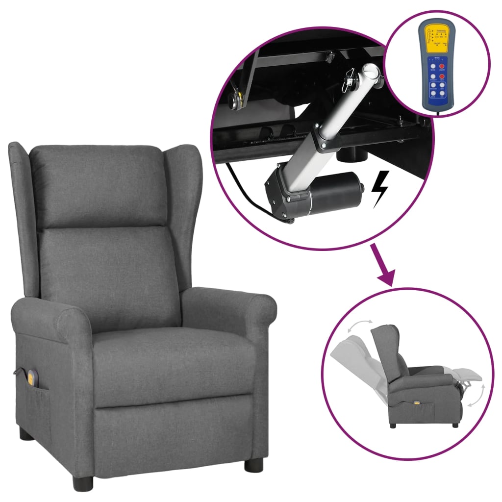 Denna massagestol blir en utmärkt sittlösning i ditt vardagsrum. Den öronlappsfåtölj med massagefunktion är tillverkad av tåligt tyg och järn, vilket gör den stabil, hållbar och mjuk att sitta i. Massagefåtöljen har 6 massagepunkter för rygg, sits. Den medföljande fjärrkontrollen låter dig välja olika massageprogram. Med ett knapptryck kan sitsen värmas upp för en ännu mer avslappnande upplevelse. Dessutom kan ryggstödet justeras bakåt och fotstödet uppåt. Detta gör att du kan ligga ner bekvämt. Denna massagestol är också utrustad med sidficka för fjärrkontrollen.