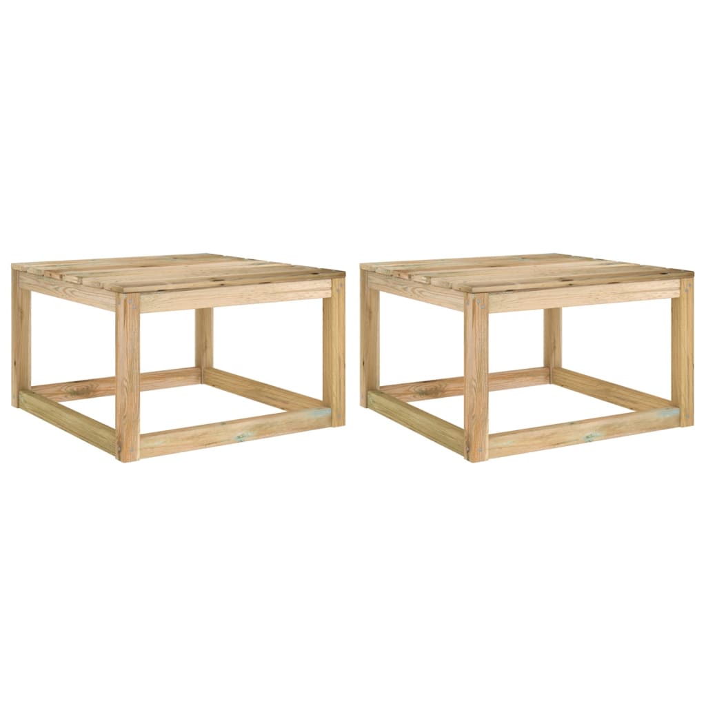 Gör fint på din uteplats med dessa 2 pallbord i trä. Trädgårdsbordet är tillverkat i impregnerad furu, vilket gör det hållbart, väderbeständigt och miljövänligt. Trädgårdsbordet har en massiv konstruktion och kräver inte mycket underhåll. Tillsammans med dynor (ingår ej) kan det användas som ottoman och bli en bekväm sittplats för dig och dina gäster. Detta träbord är speciellt utformat för att fungera som en del av en loungegrupp och det kan också användas som ett separat bord. Du kan kombinera det med andra modulära möbler såsom mittensektioner och hörnsektioner för att skapa dina egna personliga konfigurationer i trädgården! Observera: För att förlänga livslängden på dina utemöbler, rekommenderar vi att du rengöra dem regelbundet och inte lämnar dem utomhus utan skydd i onödan.Rengör : Använd en mild tvållösning.Förvaring: Om möjligt, förvara på en sval, torr plats inomhus. Om produkten förvaras utomhus, skydda den med ett vattentätt överdrag. Torka överflödigt vatten eller snö från plana ytor efter regn eller snöfall. Ha tillräcklig luftcirkulation för att undvika fuktrelaterade skador.