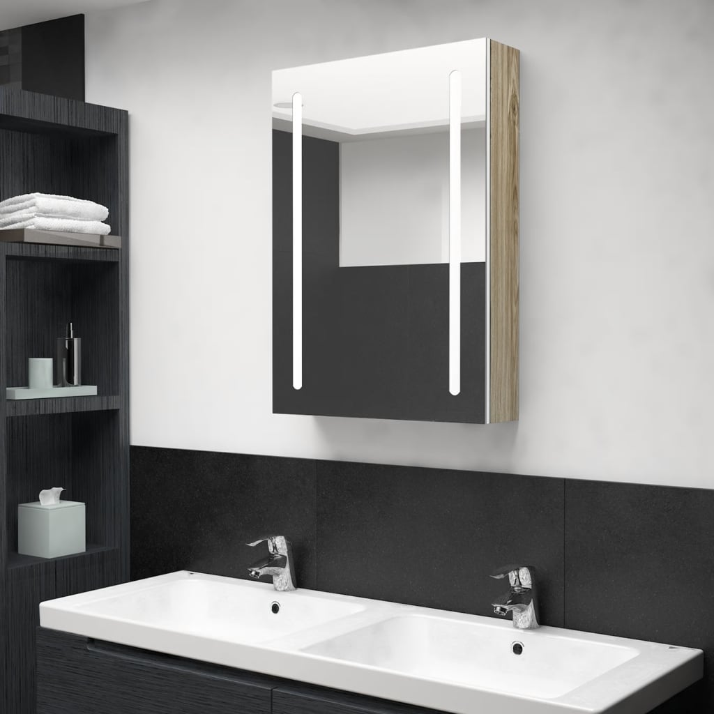 Introducera en estetiskt tilltalande detalj i ditt badrum med våt spegelskåp med LED! Vårt väggmonterade skåp med LED och spegel bidrar till en modern känsla i alla rum med sitt mjuka ljus! Det är tillverkat i kvalitativ MDF med melaminfinish, som säkerställer skåpets hållbarhet. Det har en LED-slinga med hög energieffektivitet, så du kan se dig själv i spegeln när du sminkar dig, rakar dig eller tar hand om din hud, det fina ljuset lyser upp ditt ansikte och ditt leende. Inuti finns 3 hyllor med gott om plats för dina olika badrumsartiklar. Du kan enkelt tända och släcka lampan med en knapp undertill. Det är snyggt och funktionellt och gör ditt badrum utomordentligt originellt.
