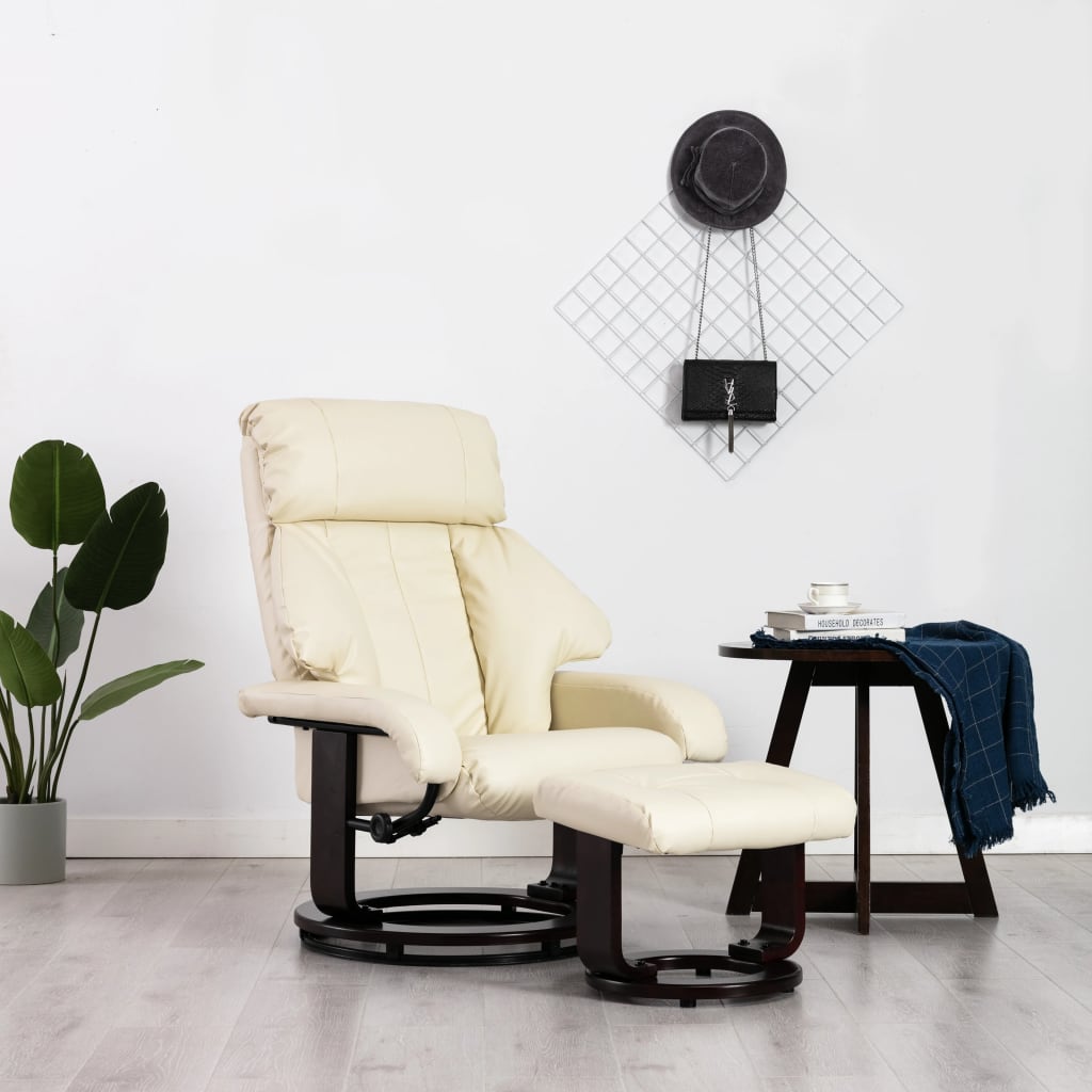 Koppla av i denna lyxiga, justerbara fåtölj i konstläder med fotpall. Den erbjuder dig lyx och glamour som kommer väl till pass när du kopplar av i ditt vardagsrum. Denna TV-fåtölj av konstläder, komplett med fotpall, kombinerar stil och funktion. Uppsättningen har en stark ram i plywood och stål, fyllt med högdensitets skum och klädd i högkvalitativt konstläder för maximal komfort. Den tjocka sitsen och det mjuka ryggstödet är högst bekväma. När du justerar ryggstödet kan du lägga upp fötterna på vår sköna fotpall. Placera denna fåtölj av konstläder i ditt rum för att skapa en mysig plats att läsa, titta på TV eller bara koppla av.