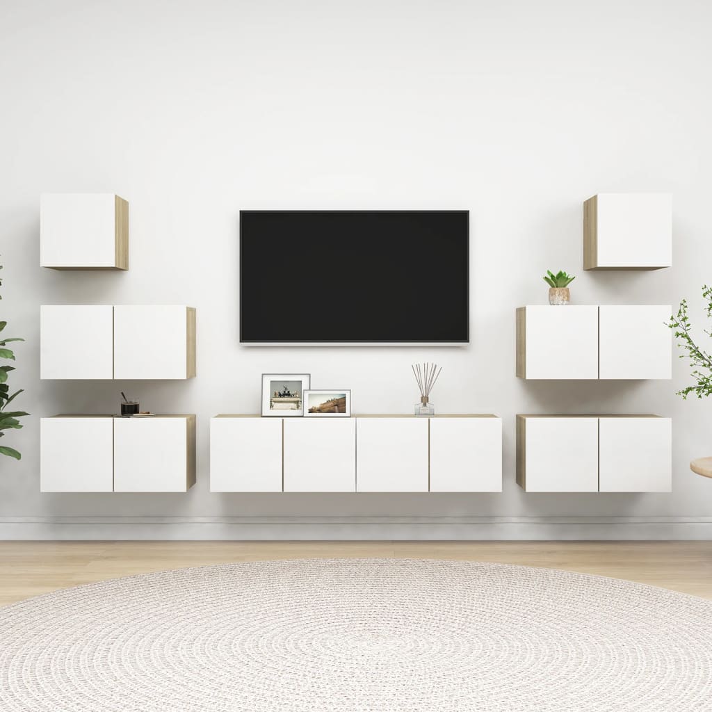 Denna uppsättning TV-skåp med modern design och stort förvaringsutrymme blir en mittpunkt i ditt vardagsrum. Dessa hängande TV-skåp är tillverkade i spånskiva, vilket gör dem robusta och hållbara. Skåpsetet monteras till väggen, vilket gör det till ett tidlöst tillskott i ditt hem. Setet har flera fack som gör det till en bra plats för förvaring av alla dina tidskrifter, DVD-skivor eller andra föremål. Detta skåpset är enkelt att rengöra med en fuktig trasa.