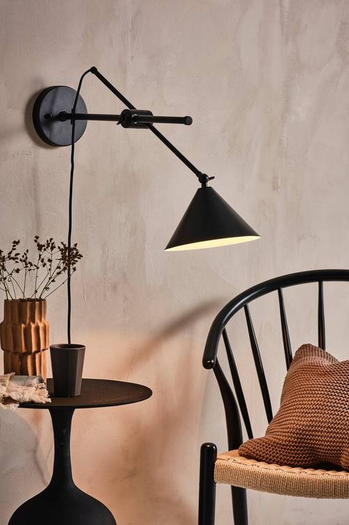 Vägglampa i metall med ställbar arm och skärm. En modern och kaxig vägglampa med tvinnad textilkabel som ger lyxig känsla. Sladdlängd 25/150 cm. Glödlampa medföljer ej. Material: Metall. Storlek: 75x22x60 cm. Sockel/lampa: 1 st E14, max 40 w glödlampa eller max 7 w lågenergilampa. Tips/råd: Snygg över skrivbordet, över köksbänken eller vid mysfåtöljen.