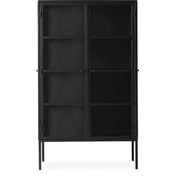 Vitrinskåp, 4 luckor och maxbelastning 10 kg. per hylla. – Stomme i pulverlackerad svart metall och luckor/sidor i härdat klarglas
