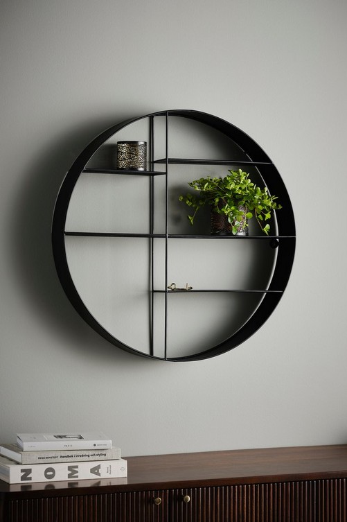 Rund vägghylla av pulverlackad metall. Snygg, rund modell med hål för upphängning. Maxbelastning 15 kg. Material: Metall. Storlek: ø 68 cm, djup 8,5 cm. Skötselråd: Torkas av med lätt fuktad trasa.